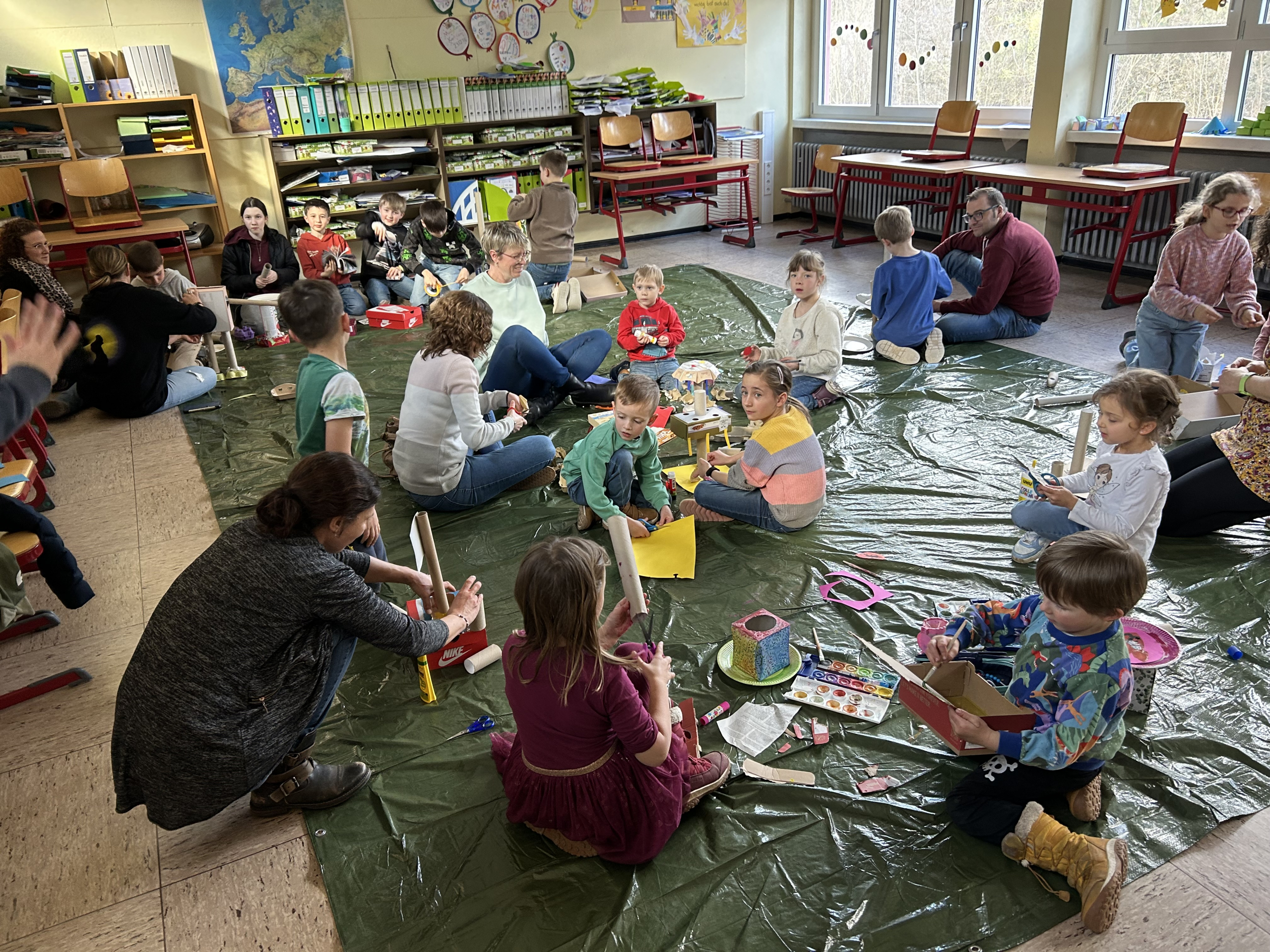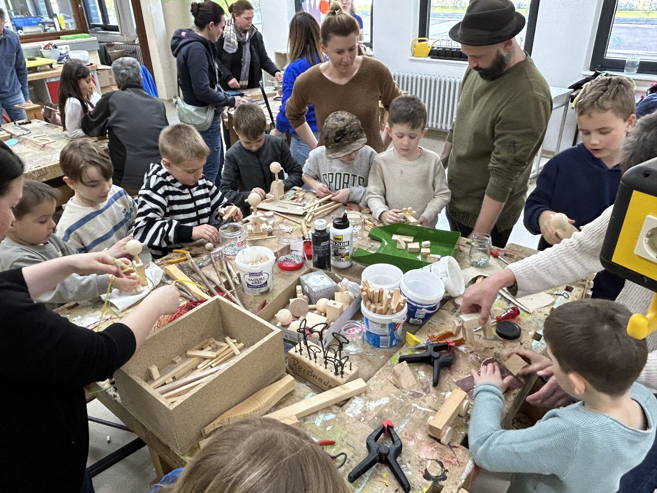 Im Technikraum werkelten mit Begeisterung die jungen Künstler mit verschiedenen Holzteilen. Eifrig wurde geschraubt, geleimt und gesägt, wobei die Kinder z.T. von Omas und Opas oder Eltern bei kniffligen Fragen oder einer helfenden Hand unterstützt wurden. So entstanden mit großer Freude am gemeinsamen Basteln und viel Fantasie kreative Fabelwesen, Tierfiguren und Fahrzeuge.
