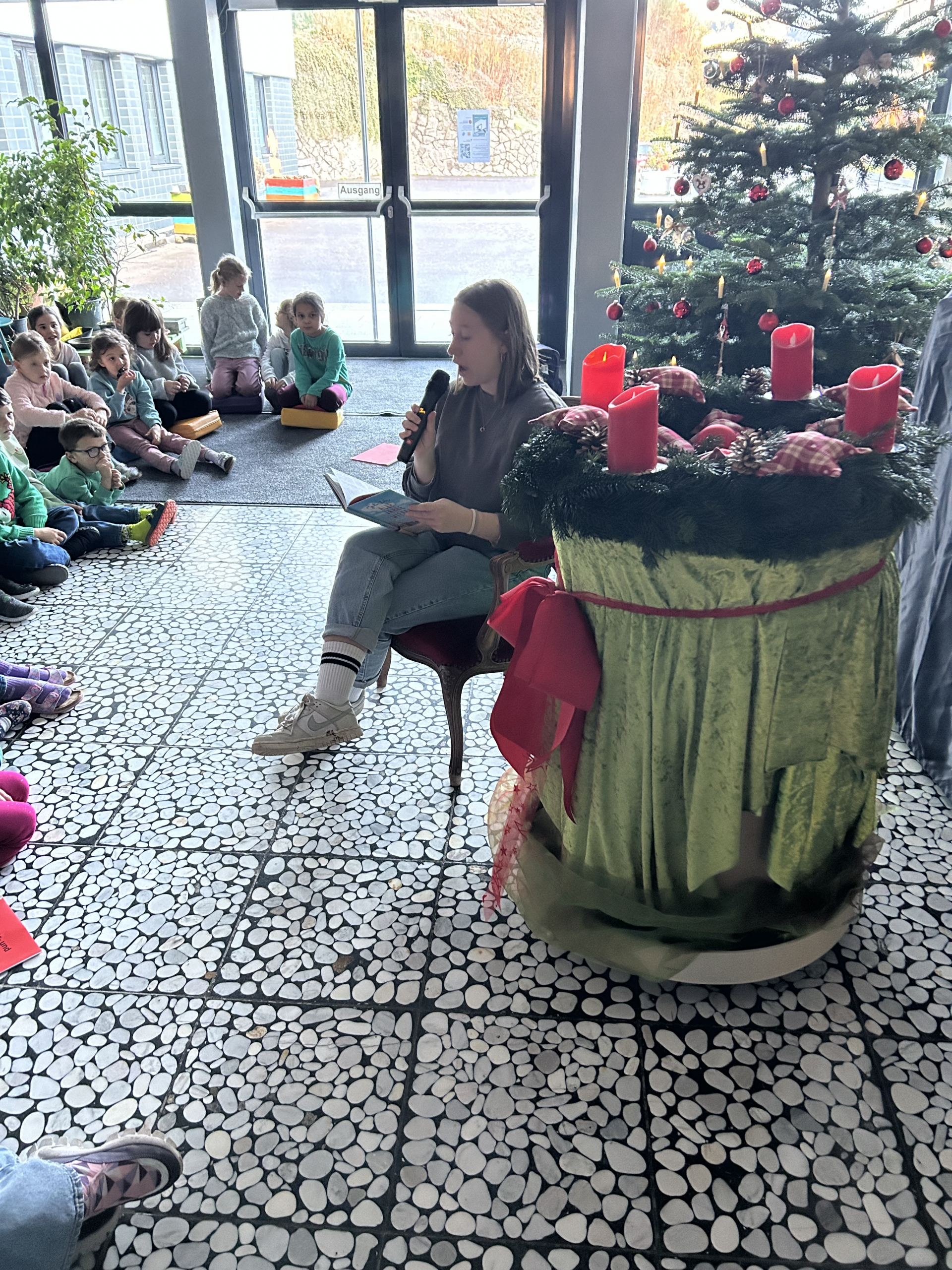 Vor dem geschmückten Weihnachtsbaum stand der königliche Vorlesesessel. Die Lehrerinnen Susan Adam, Annette Denu und Theresa Simons nahmen im Wechsel darauf Platz um von Woche zu Woche einen Teil der Lektüre- „Alle Jahre wieder“ von Juli Zeh vorzulesen. Lena und Josh sind sicher: An Heiligabend kann nichts mehr schiefgehen und sie freuen sich auf die Bescherung. Stattdessen passiert … nichts. Kein geschmückter Baum, keine Geschenke. Der totale Reinfall. Ob die beiden etwas falsch gemacht haben?…