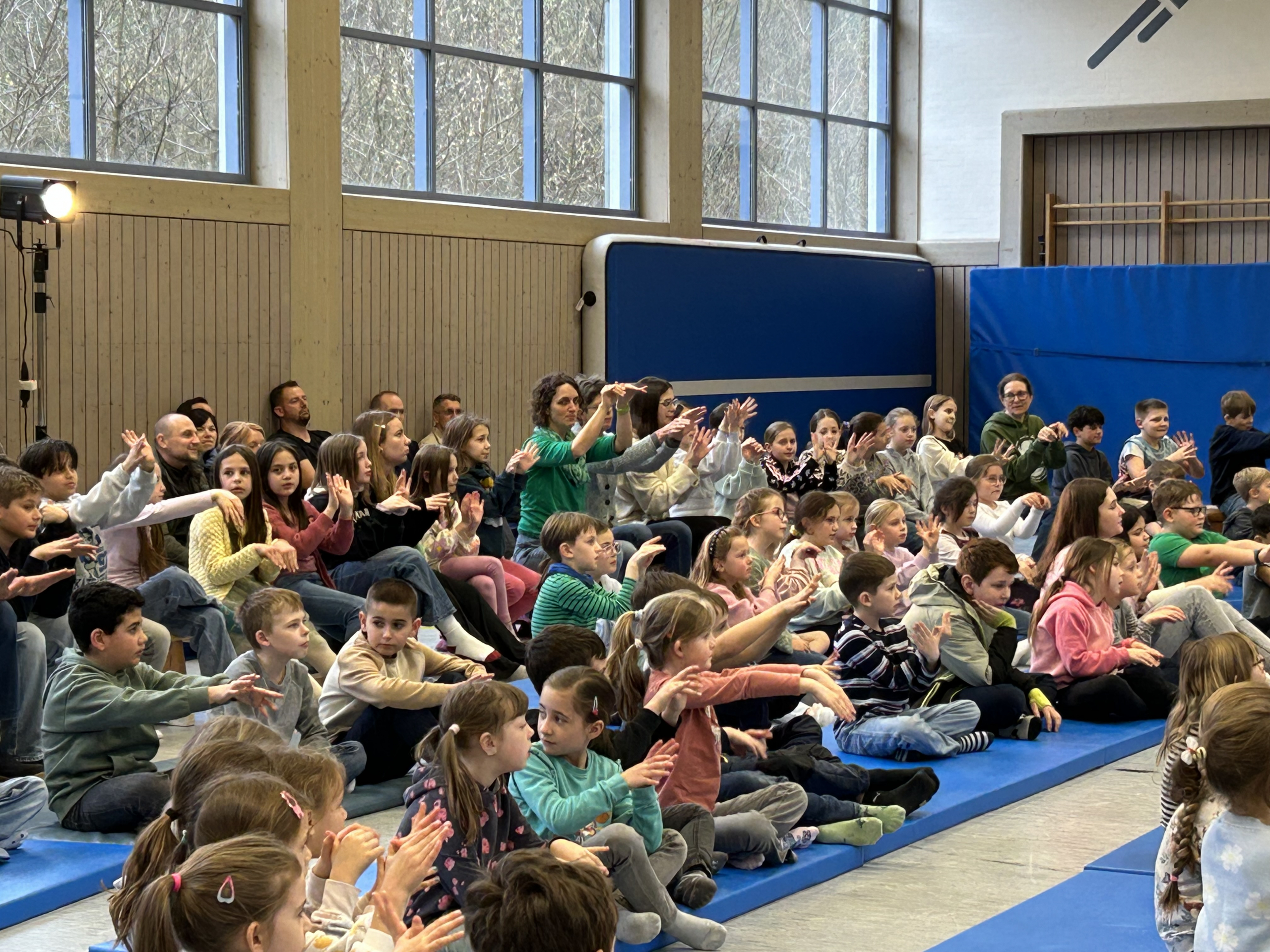 Im Rahmen des sozialen Lernens stand das Thema „Konflikte gewaltfrei lösen“ im Mittelpunkt. Mit Frank Ströber, Anerkennungsträger des Heidelberger Präventionspreises des Vereins Sicheres Heidelberg e.V., erlebten die Schülerinnen und Schüler ein interaktives Theaterstück, das zum Mitsingen, Mitmachen und Mitdenken einlud. Im Fokus standen zentrale soziale Kompetenzen wie Kommunikations- und Streitfähigkeit, der Umgang mit negativen Gefühlen sowie Akzeptanz und Solidarität. Die Kinder nahmen die Inhalte nicht nur begeistert auf, sondern setzten sie aktiv um. Bereits im Vorfeld wurden Lieder einstudiert, so dass während der Aufführung kräftig mitgesungen werden konnte. Auch auf der Bühne waren viele Kinder der Schule beteiligt, ob an Klanginstrumenten oder als Vortänzerinnen und Vortänzer.
