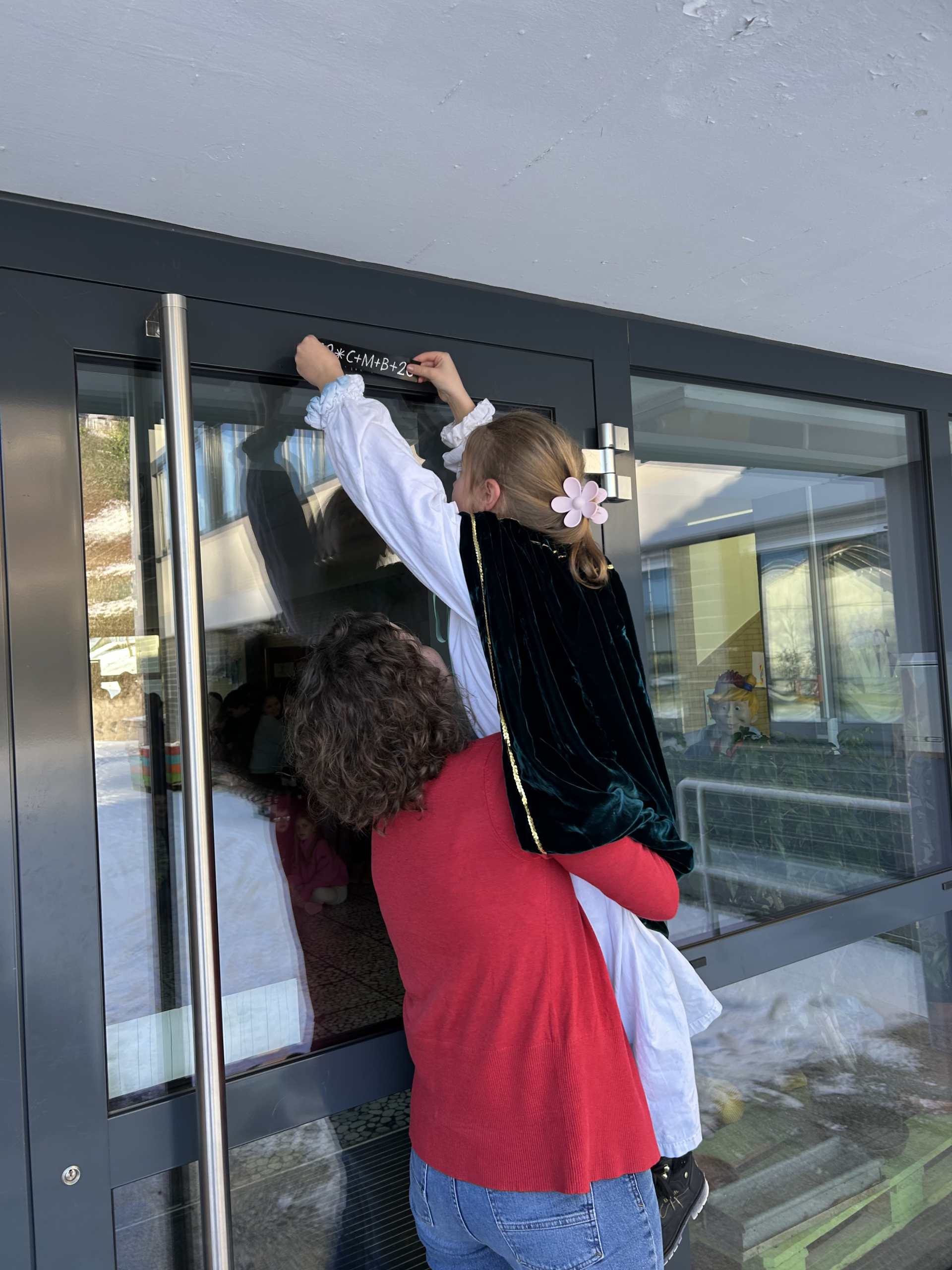 Nachdem der neue Segen an der Schultür angebracht war, machten sich die acht Sternsinger-Schulkinder auf den Weg zum Kindergarten.